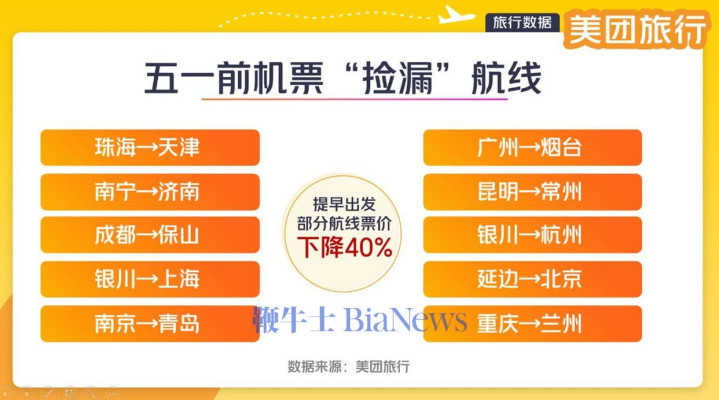 提前错峰出游,实惠多多。美团旅行数据显示,“五一”前夕,国内部分航线票价较去年同期下降40%左右。