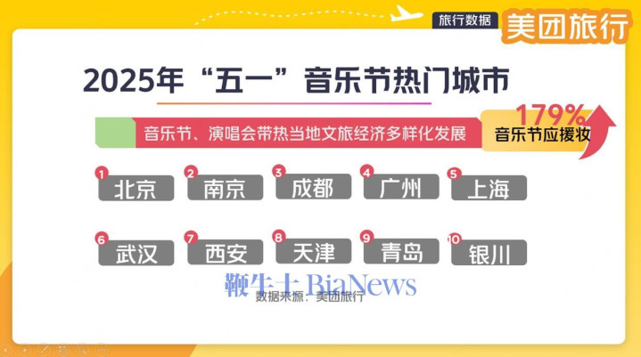 据美团旅行数据,“五一”音乐节Top10的热门城市为:北京、南京、成都、广州、上海、武汉、西安、天津、青岛、银川。此外,受演唱会、音乐节带动,宝鸡、常州、滁州、孝感、阜阳、伊宁成为“五一”热门小城。