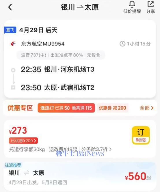 ▲美团黑钻会员实付273元可乘“银川→太原”公务舱(图源:美团App截图)